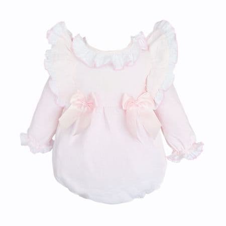 Beautiful Baby Pink Romper with frill collar and bows to front