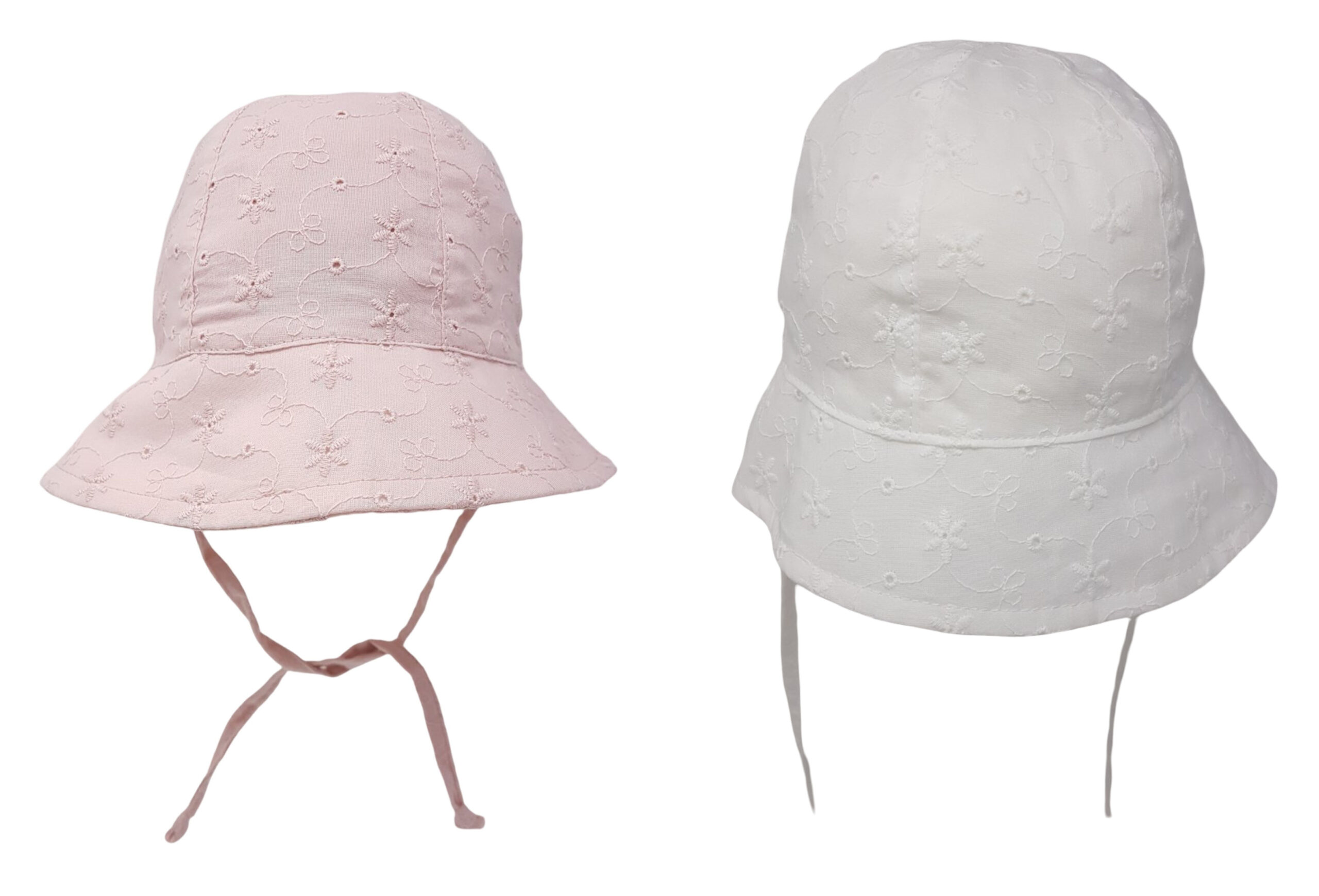 Featuring delicate broderie anglaise embroidery and secure chin ties, this hat stays in place during outdoor play, pram walks and holidays.