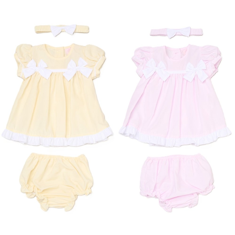 The Pink PEX Miranda Dress features a cute knit pattern and a charming ribbon bow, complemented by a crisp white collar. Perfect for your baby girl, this dress combines adorable style with comfort and quality.