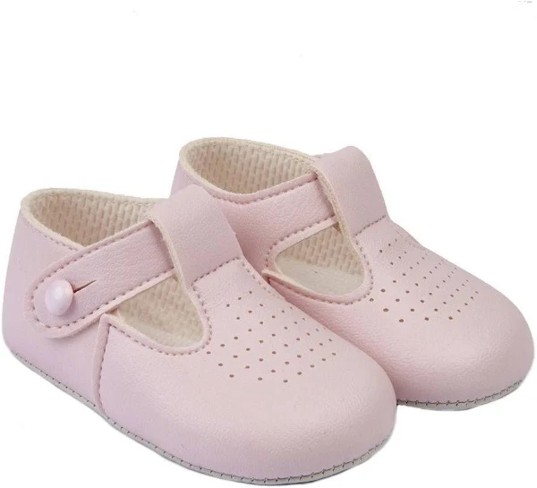 These pre-walker baby shoes, from our Baypods collection, are beautifully made in soft faux leather and have a dainty holed pattern on the toes. In a t-bar style, they are easy to put on and secure with a button fastening strap. They have a lightly cushioned insole and their flexible soles are just right for developing feet.