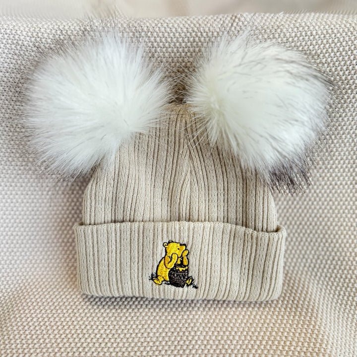 A taupe ribbed hat with super cute double faux fur pom and pooh bear embroidery!