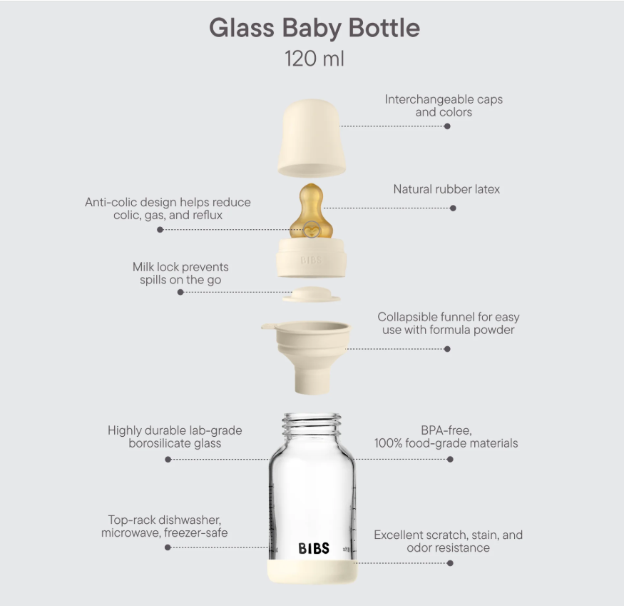 Ready to upgrade your feeding routine? BIBS’ Glass Baby Bottle offers a sleek, award-winning design with an anti-colic valve to reduce gas and reflux, and a breast-like nipple that eases the transition between breastfeeding and bottle feeding. Featuring a dishwasher-safe, durable glass base that maintains a like-new appearance over time, and spill-minimizing components for convenient feeds at home or on the go. The ultra-soft, hypoallergenic medical-grade silicone nipple is easy to sterilize, reinforced with ribbing for added durability, and includes an anti-slip texture for a secure latch. Comes with a slow-paced flow, with additional flow rates available as your baby’s feeding pace changes. BPA-free / Ages 0+