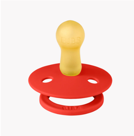 Our Colour pacifier is the original BIBS pacifier and has been on the market for over 40 years. It has the signature round BIBS shield with three vent holes and round BIBS engraved handle ring.