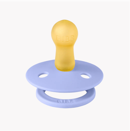Our Colour pacifier is the original BIBS pacifier and has been on the market for over 40 years. It has the signature round BIBS shield with three vent holes and round BIBS engraved handle ring.