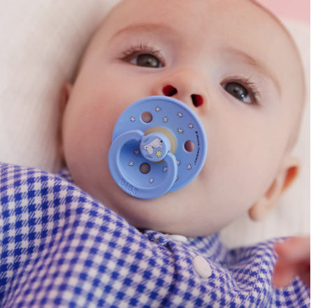 Our Colour pacifier is the original BIBS pacifier and has been on the market for over 40 years. It has the signature round BIBS shield with three vent holes and round BIBS engraved handle ring.