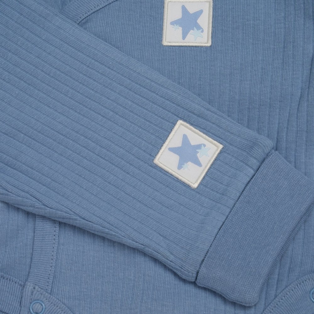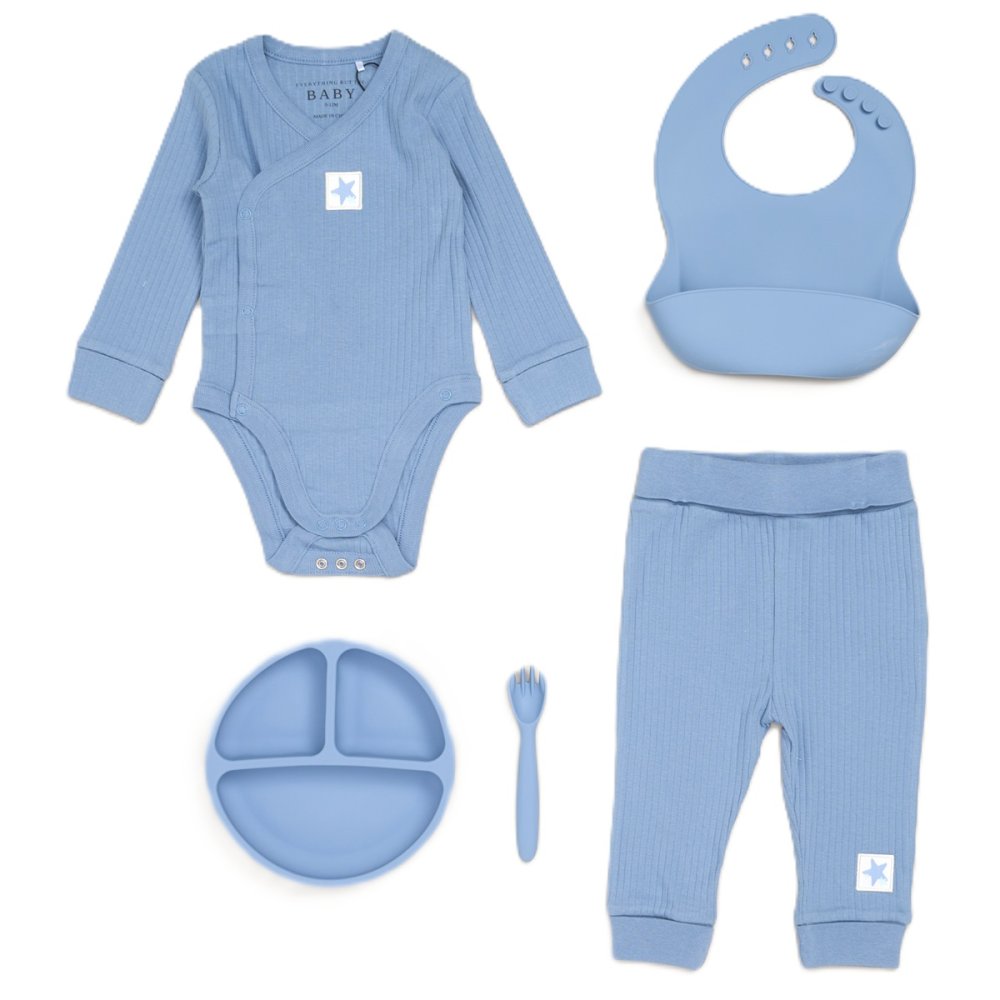 Blue Ribbed Bodysuit & Pants With Food Catcher Bib/Bowl/Spork