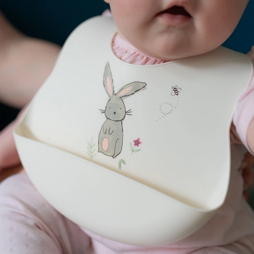 Protect your little one’s clothes with our gorgeous Bunnies design silicone bib. Prevents clothes being stained and saves time by not having to change baby’s clothes. The wide and deep pocket catches food and drink to reduce waste and mess. The soft and bendy silicone is comfy for babies to wear. Easy to put on with its side neck button fastening. One size, fits from 3 to 36 months. Double buttons can be fastened in 5 different ways to ensure a snug soft fit round the neck that adapts to your growing child. Made from non-toxic, BPA free, food grade silicone rubber. Rolls up to a small compact size, easy to pop into a changing bag for feeding when you are out and about. Wipe clean or wash in warm soapy water and air dry. Dishwasher safe.