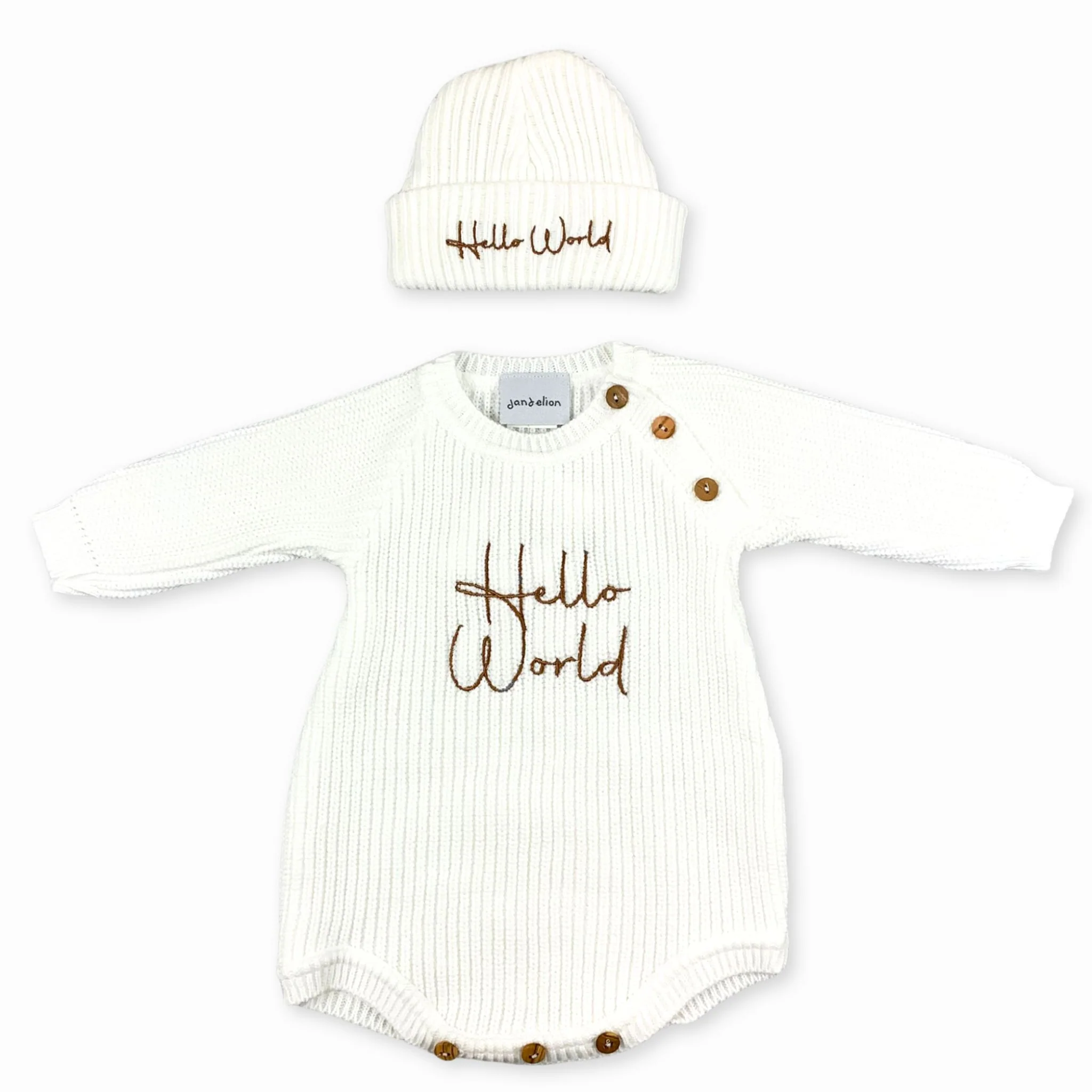 Dandelion White Knitted “Hello World” Romper & Hat Set