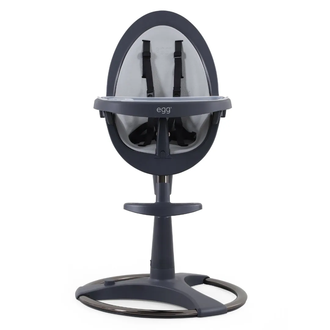 egg® Highchair includes base, centre support, main tray, upper tray, adjustable footrest, anti-slip post, chair with seat pad and safety harness
