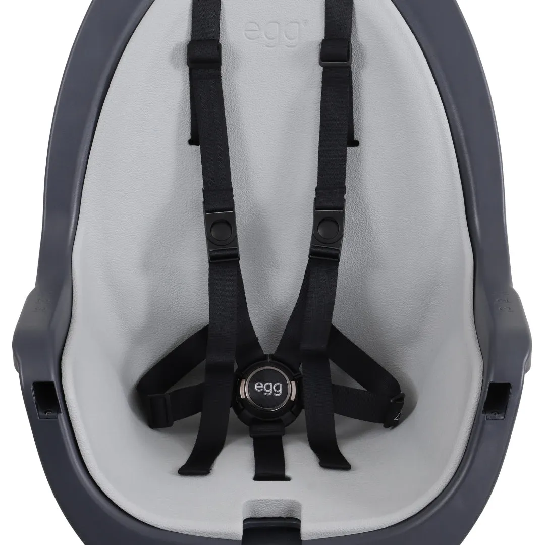 Suitable for babies from 6 to 36 months (up to 15kg), the egg® Highchair includes a soft, wipe-clean EVA seat pad, a 5-point magnetic harness, a 3-position meal tray with cup holder, and with a dishwasher-safe top tray.