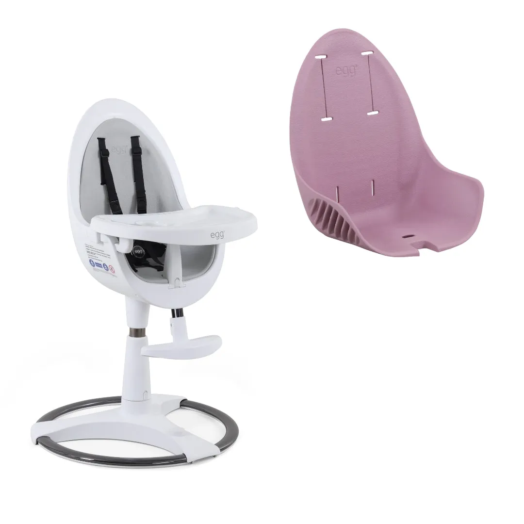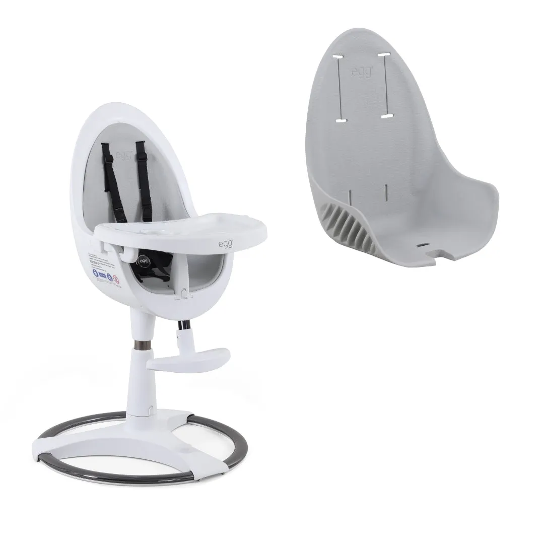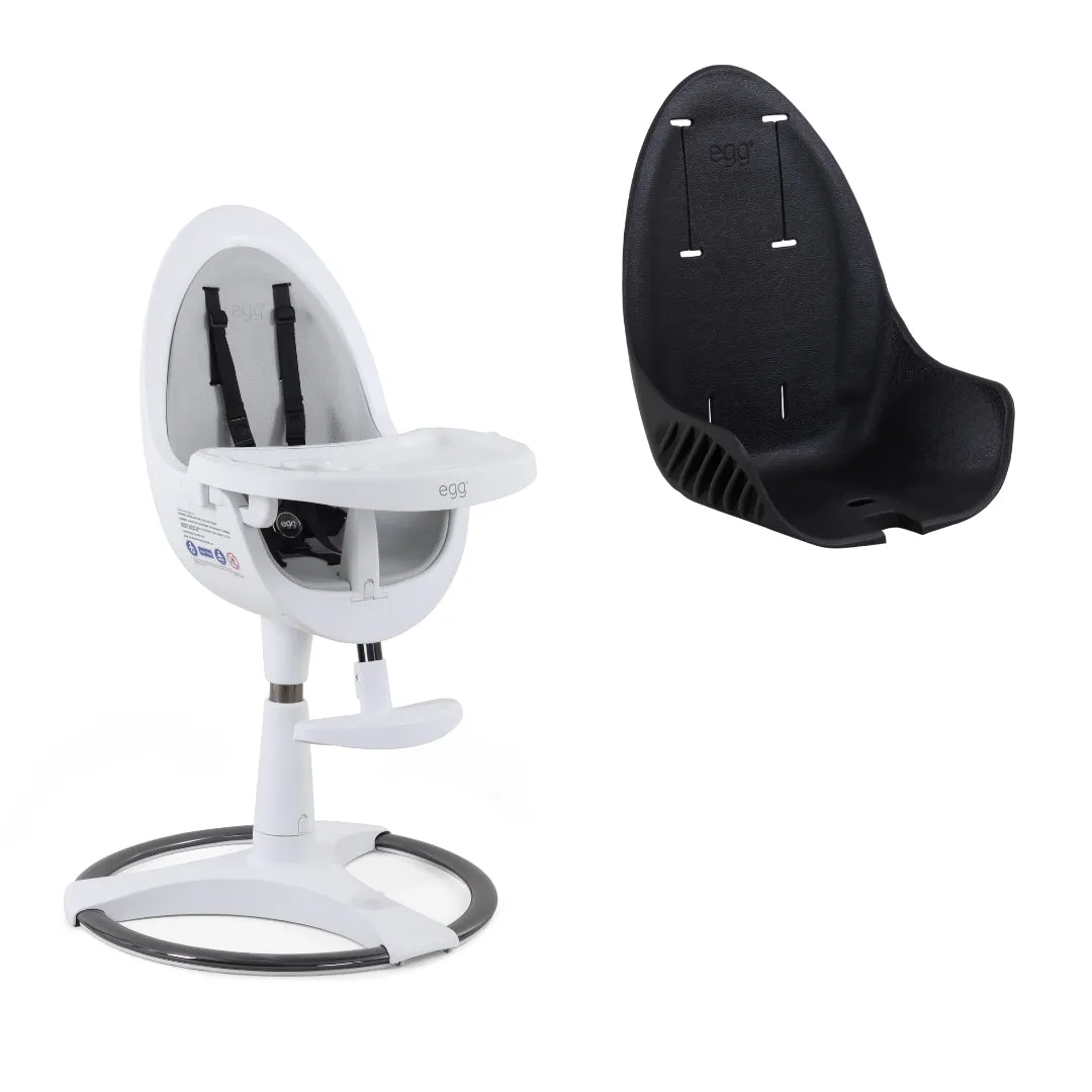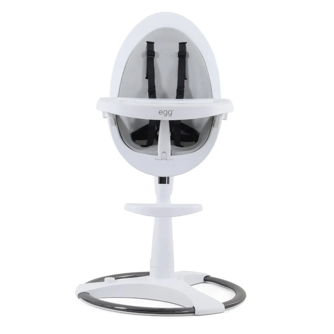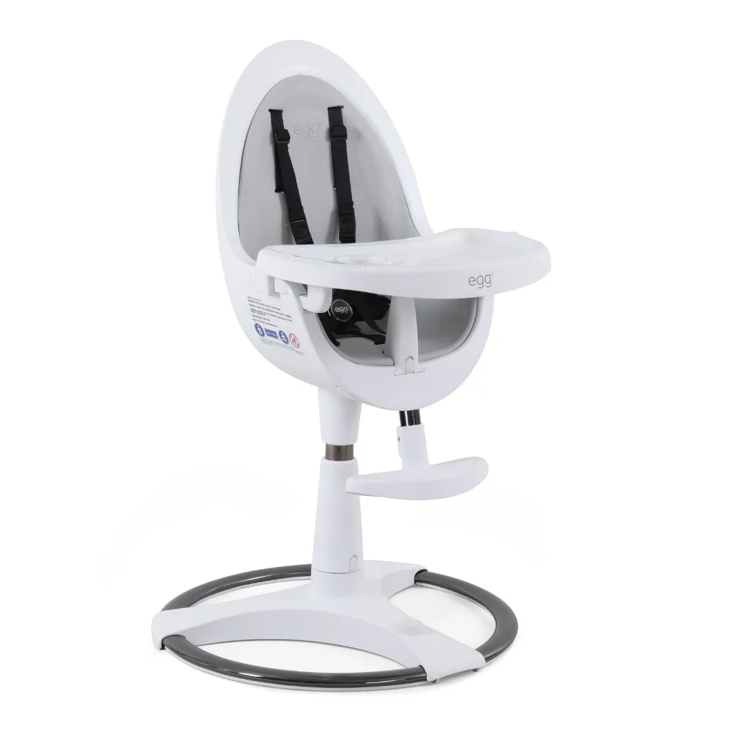 egg® Highchair includes base, centre support, main tray, upper tray, adjustable footrest, anti-slip post, chair with seat pad and safety harness