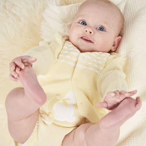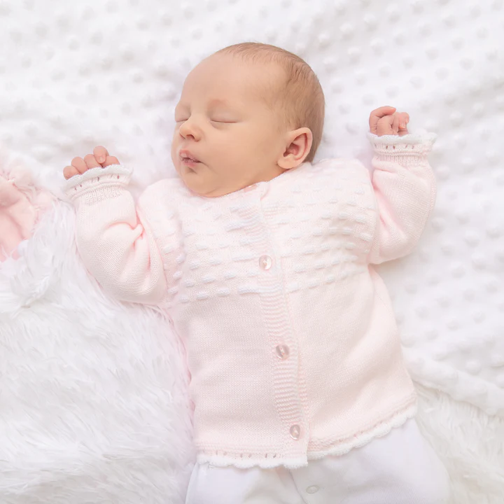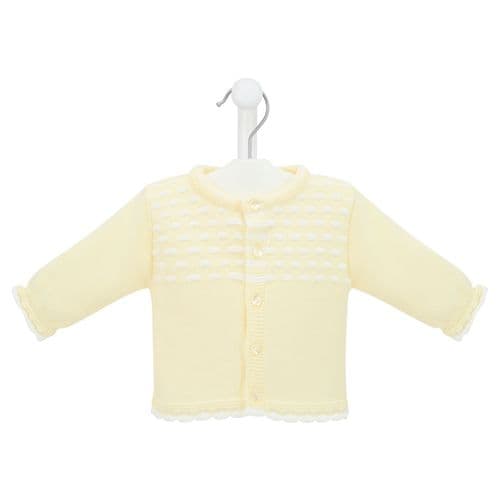 AÂ knitted cardigan with buttons down the front, ideal to wear over sleepsuits to keep your little one cosy!