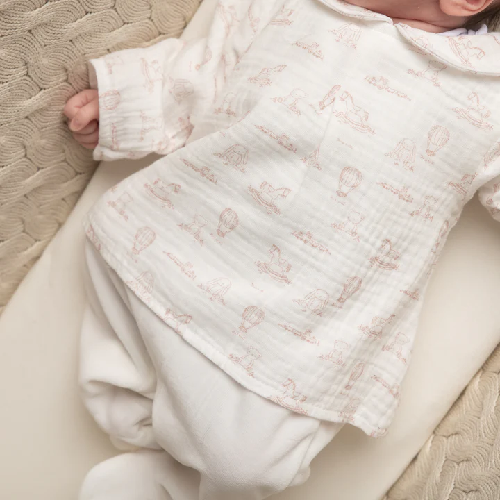 A super cute design from PEX for AW24. A soft velour sleepsuit with muslin style pink toys print layer on the top.