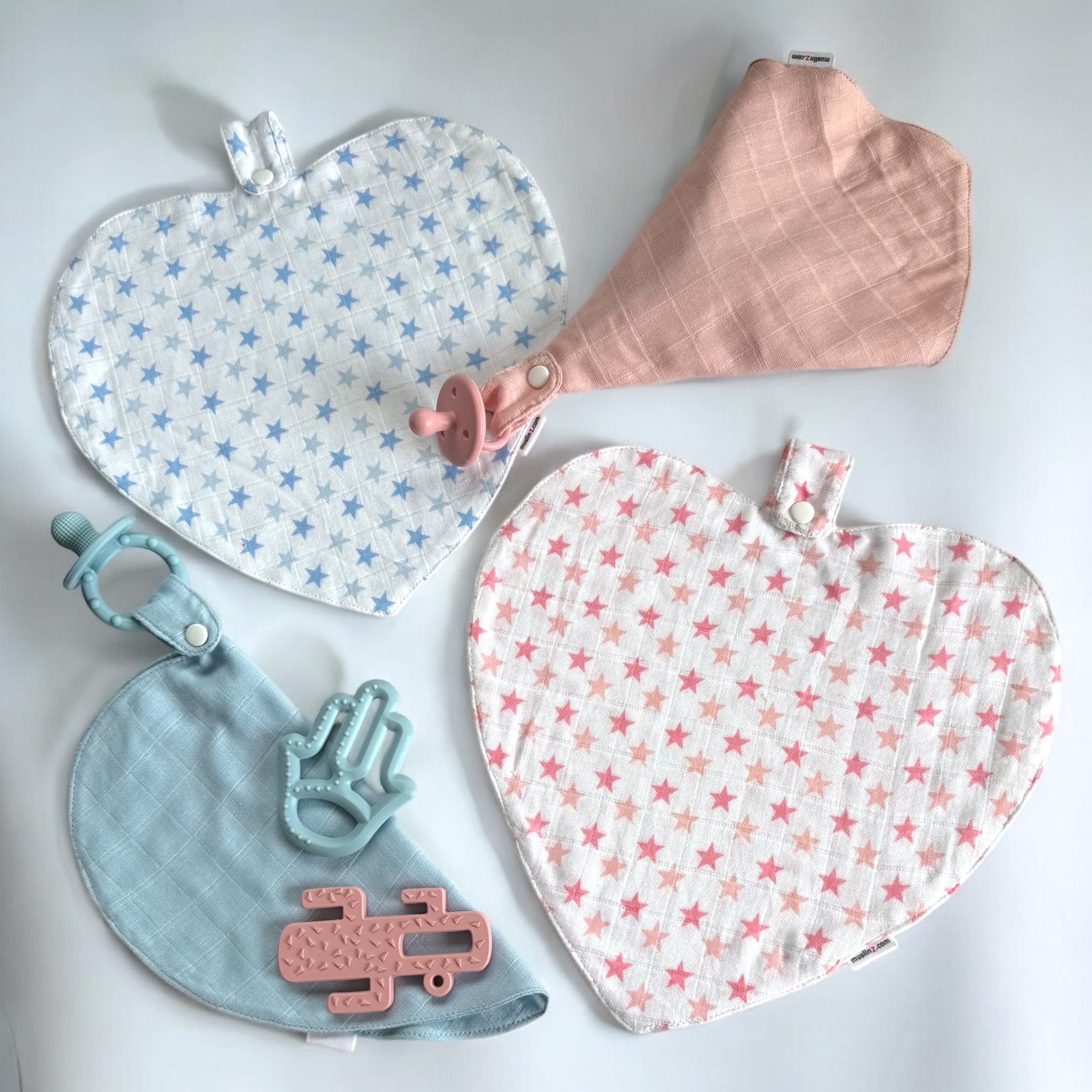 Multi-Functional Essential: Our Mini Muzi is made from 100% cotton and meets the Oeko-Tex 100 standard. Ultra-absorbent, breathable, soft, and durable, it is gentle on delicate skin. Its unique heart-shaped design with a popper fastening ensures easy attachment to soothers, teethers, toys, car seat or highchair harnesses, changing bags, and it even doubles as a bib or washcloth. It’s the perfect blend of comfort, style, and practicality for modern parents.