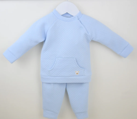 Baby Boys Quilted Set from Watch Me Grow. The top has an embroidered ‘Giraffe’. The trouser has an elasticated waist.Â