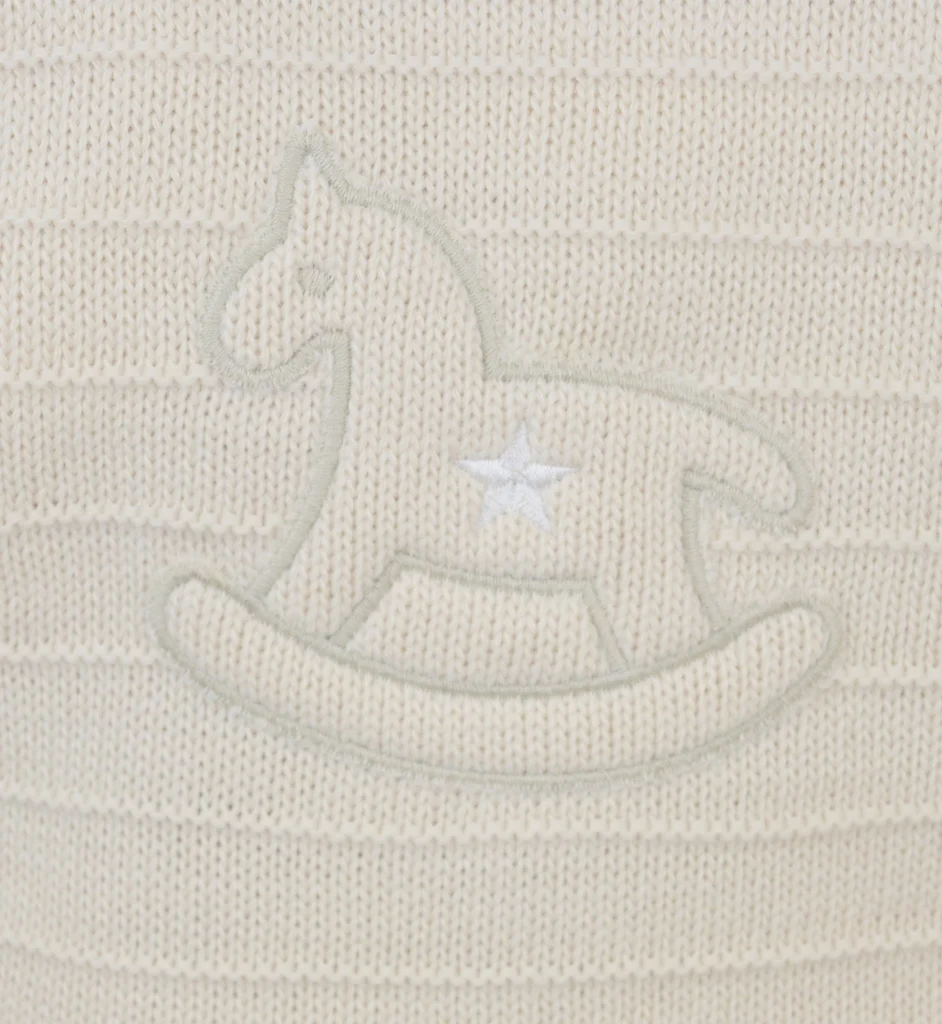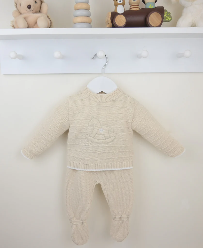 Softly knitted natural two piece baby outfit featuring the cutest rocking horse applique over the textured striped jumper. Contrast tipping at the hem and cuffs. With a matching pair of knitted trousers that have a comfortably elasticated waist.