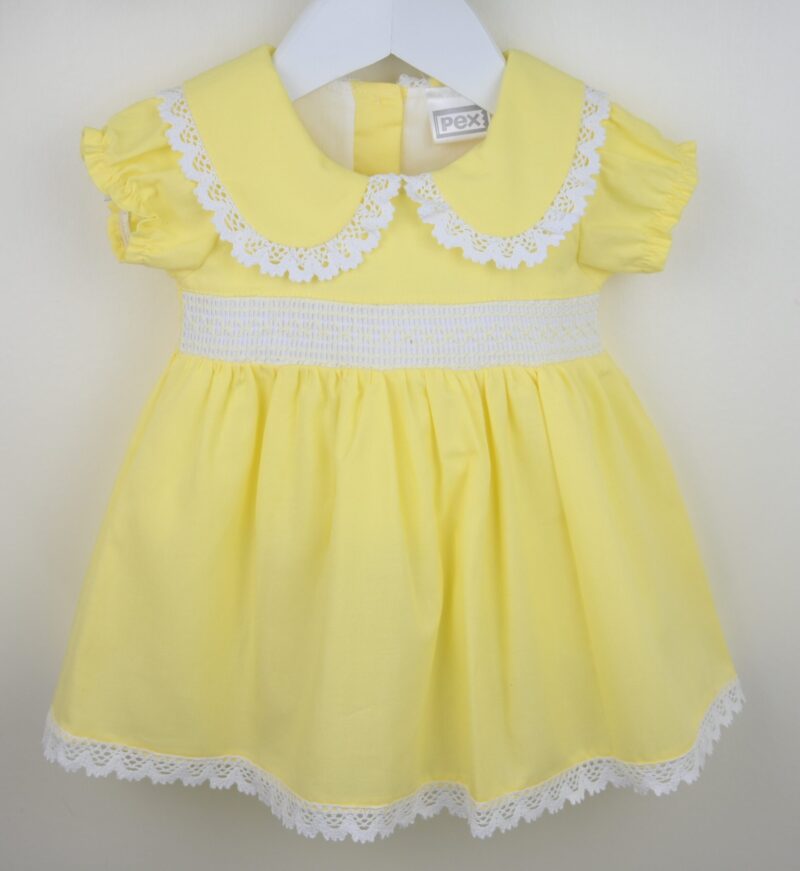 - Cute rounded collar trimmed with white lace. A central band to the chest in white with Lemon smocking.