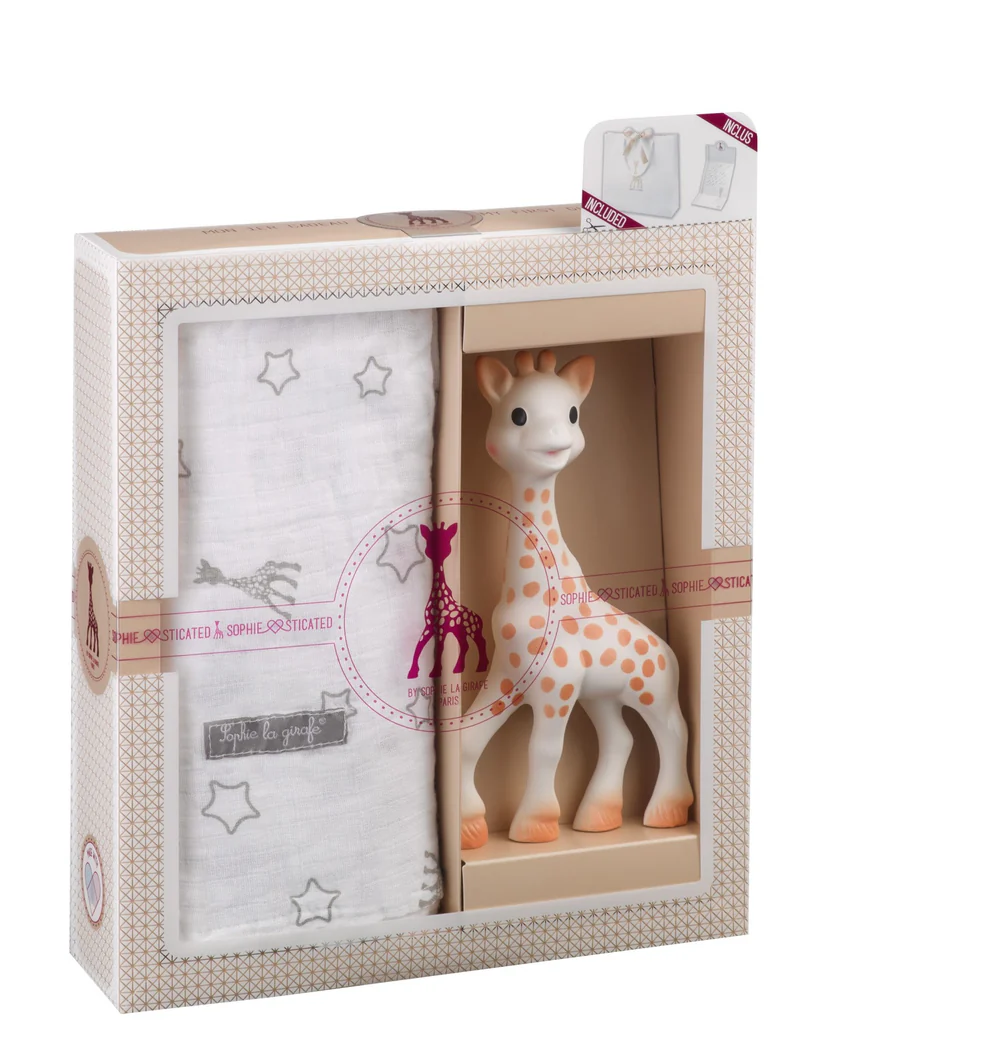This charming gift set features, an original Sophie la girafeĀ® and a Sophie la girafe Swaddling Cloth.