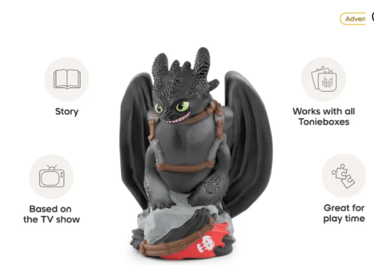 Picking up where the movie How to Train Your Dragon left off, this Tonie is based on the animated series Dragons: Riders of Berk. Join Hiccup, Toothless and their fellow dragon-riders as Vikings learn to live side-by-side with dragons. What begins as conflict becomes a tale of trust, courage and friendship as the gang prove that dragons can be a Viking’s greatest ally. All your dragon riders-in-training need to do is pop Toothless on top of their Toniebox to start the adventure.
