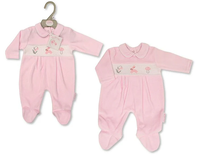 Our delightful little Classic sleepsuits are made in a wonderfully soft and cuddly velour. Lots of traditional charm with the cute peter pan style collar and decorative buttons to the neck. Convenient press studs between the legs and at the back. We also have this sleepsuit in Blue and Pink.